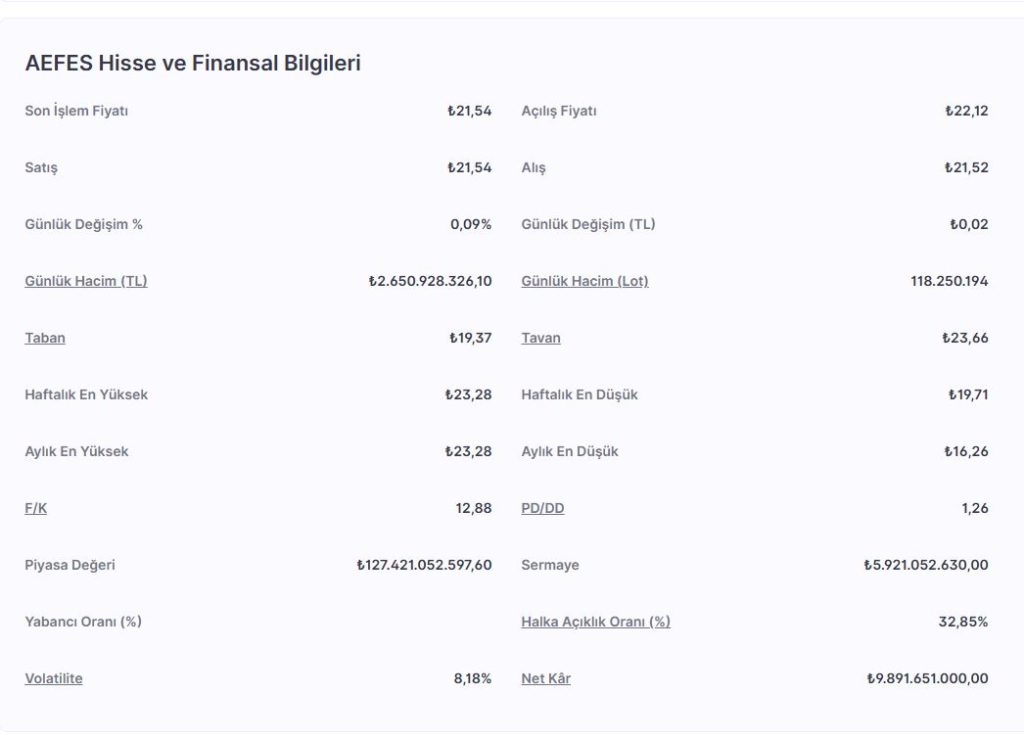 Genel tabloyu özetlemek gerekirse; AEFES düşük PD/DD oranıyla güven verirken, teknik göstergelerin (özellikle RSI) kısa vadeli bir aşırılığa işaret ettiğini unutmamak gerekiyor. Uzun vadeli yatırımcılar için trend desteği korunurken, yeni giriş yapacakların destek seviyelerini takip etmesi faydalı olabilir.